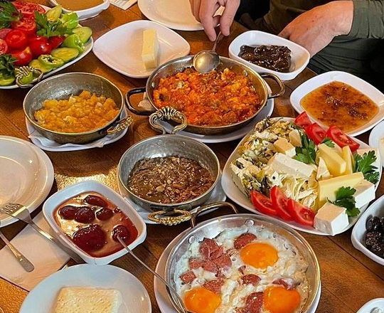 İçindekiler:B.Peynir, T.Kaşar, Çeçil Peyniri, Misket Peyniri,Van Otlu Peyniri, Tereyağı, Acuka, Reçel 3 Çeşit Bal, Kaymak, Ceviz, K.İncir, K.Kayısı, (Siyah Zeytin, Kırma Yeşil Zeytin)Baharatlı Zeytinyağı Ç,Domates, Baby Salatalık, Yeşillik Tabağı Kavurmalı Yumurta, P,Tava, Sigara Böreği, Omlet Mini Pide (sebzeli-Peynirli) Sınırsız Çay ve T Portakal Suyu